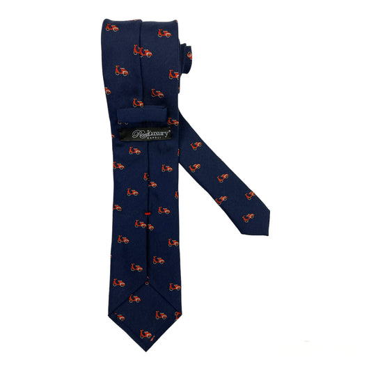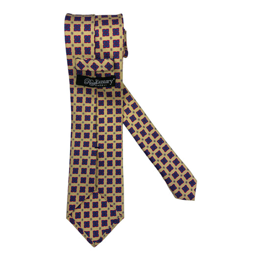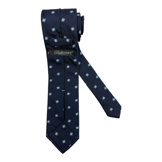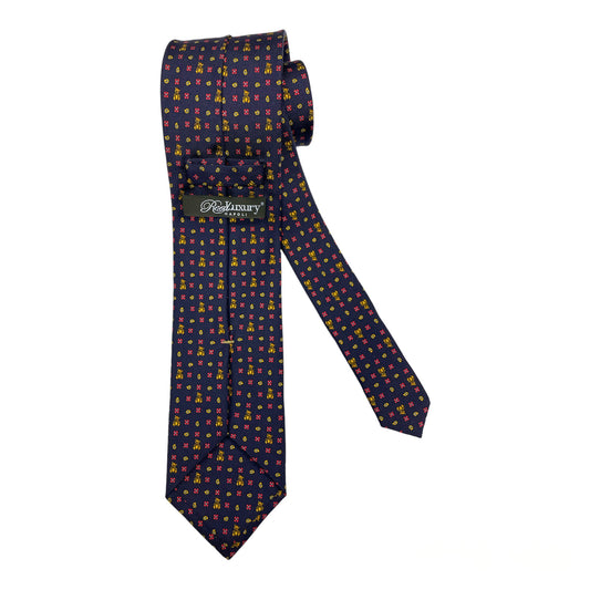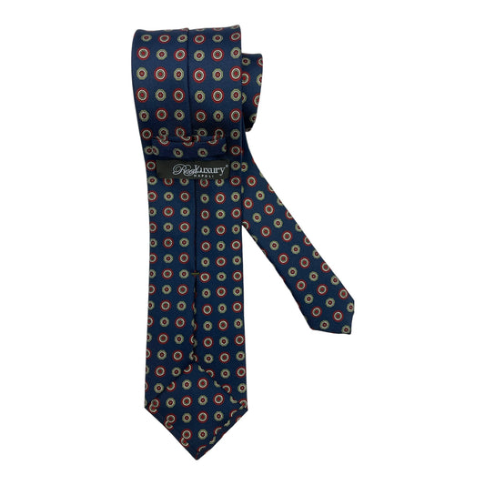 Cravatta seta blu con quadri rossi e cerchietti bianchi