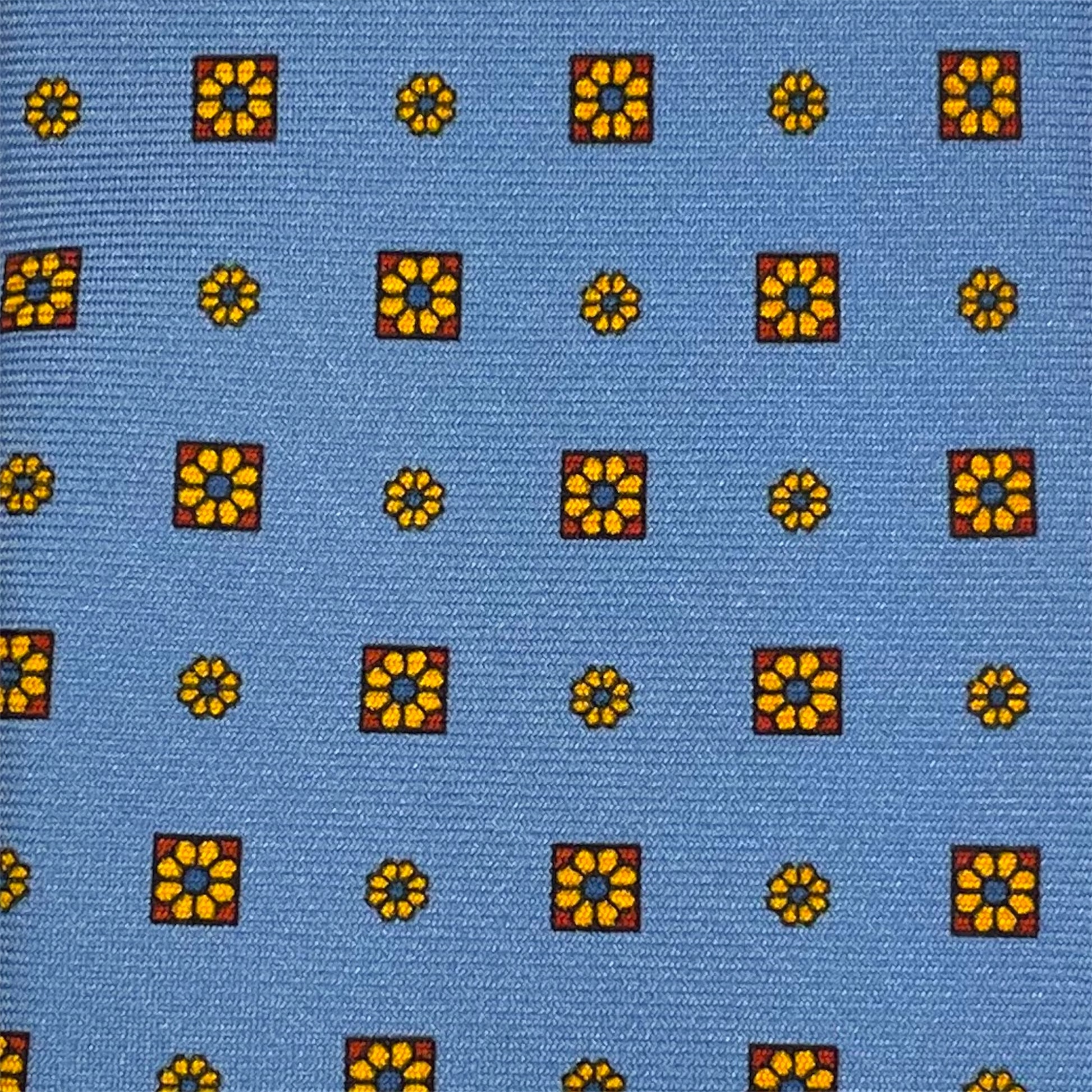 Cravatta in seta azzurra con microfantasia geometrica gialla e blu