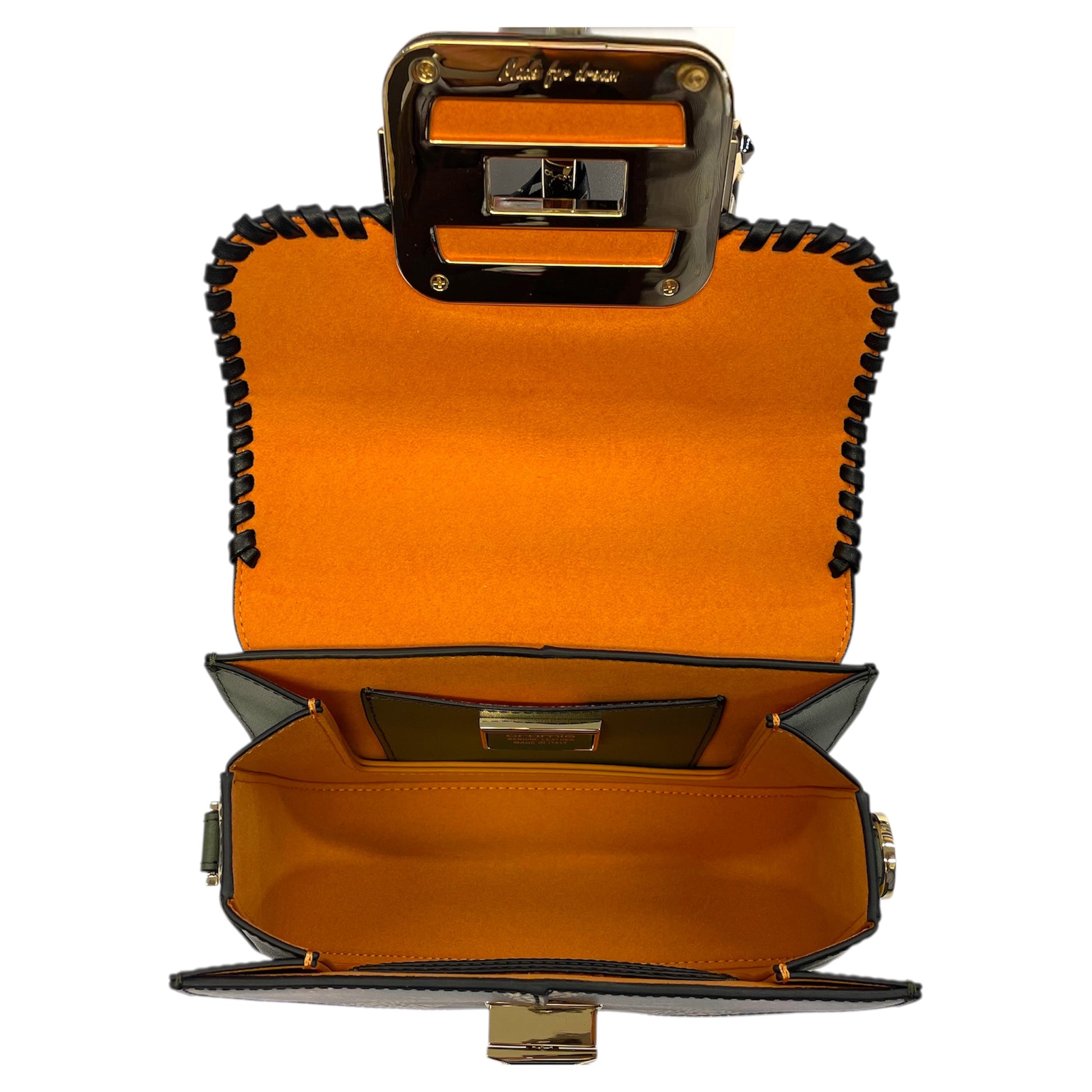 Bordino in pelle con infilature a contrasto e borchie metalliche aggiungono carattere e grinta al design.