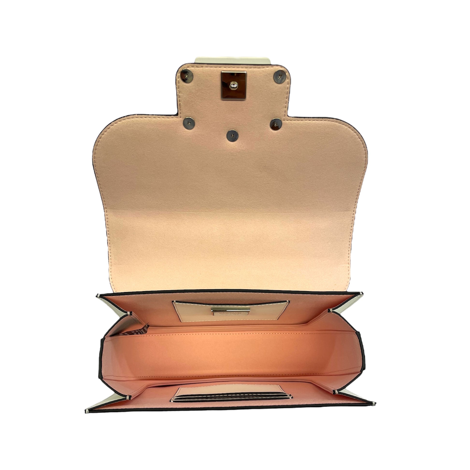 Borsa con patta, doppia vestibilità tramite la tracolla di catena che permette di indossarla a spalla o crossover.